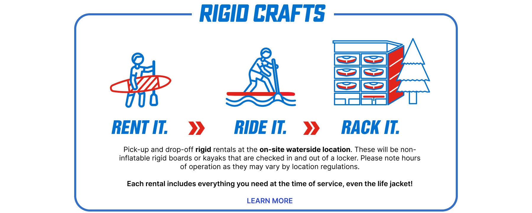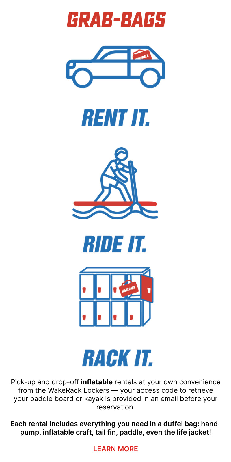 Choose between Inflatable Grab-Bags at a WakeRack locker near your favorite lake, or skip the stop and choose a Rigid Option at select waterside locations*